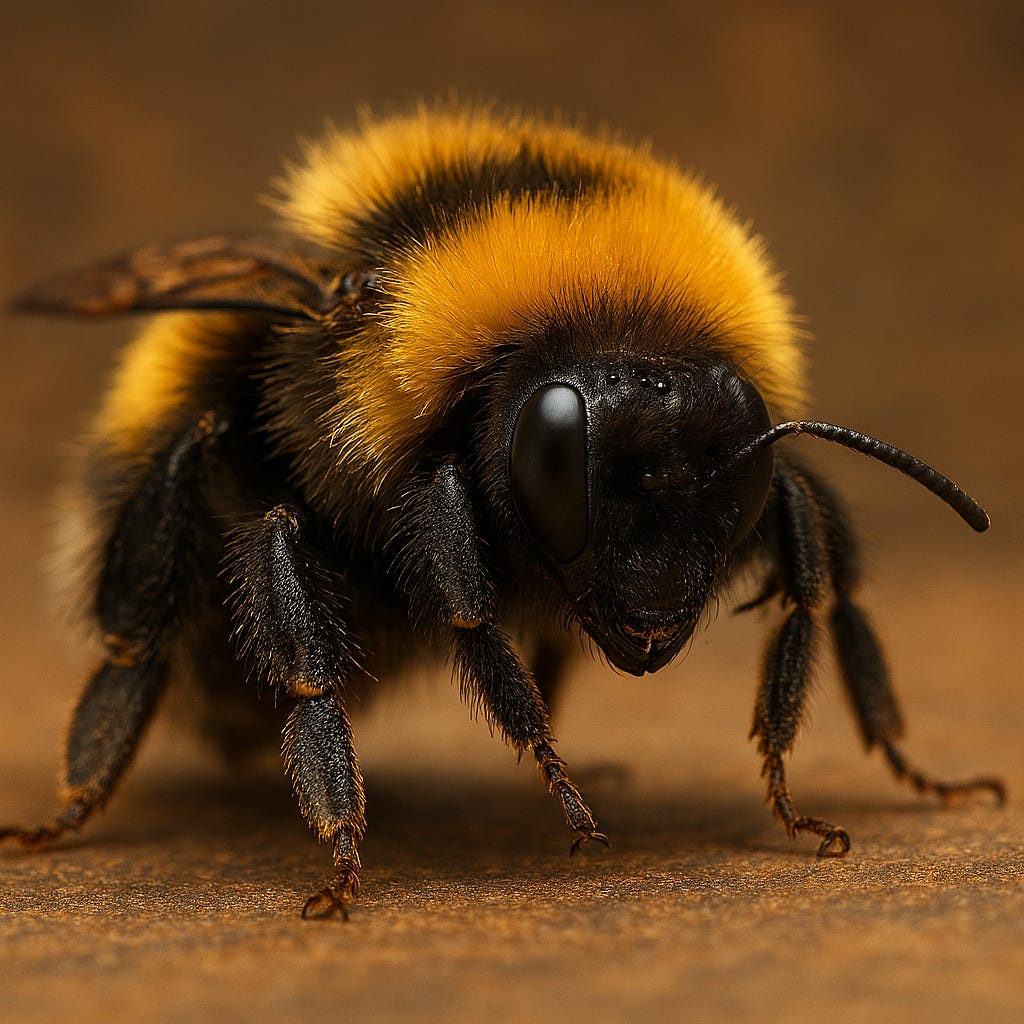 I have a bumblebee in my brain, It could well be making me insane. I feel it now, a restless sound… No one else can hear the strain. He was there right from the beginning, Buzzed me into life with honey and sting. He whispers sweetly, always singing… With him, who knows what the day may bring. As a child I felt him take my hand, Mom one side, Bee the other there. We wandered off through dreamlit land, Glowing golden infant visions everywhere. Bee in heart, I hummed off key, While others sang the practiced song. I mapped out worlds they couldn’t see, And lived where wonder tagged along.