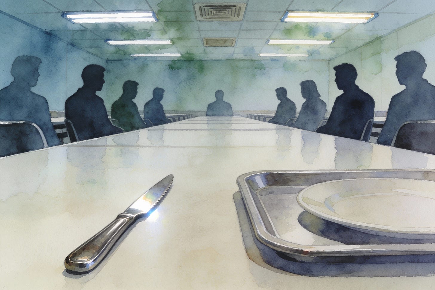 Sitting there in the work canteen, steak on the menu, station noise overhead, ten of us crammed around that rectangular table, sixty more buzzing like flies. I felt it before I heard it, that tightening, a silent boil a few chairs down, some words slipped out, sharp as shards, I missed them, but the rage hung there, thick as locomotive smoke. The guy, I knew his face from passing nods, but now it twisted, his fork in one hand, steak knife in the other, gripping tighter, not for cutting meat anymore, but for something darker, a tool turned purpose in a blink. It yanked me back, thirty years almost, 1997, clubs spat us out, all night on stimulants, dancing like fools, ten of us at some stranger's place, flying on pills, laughing, wired, until the host pulls vodka, and suddenly everyone's pouring it down, mixing fire with the high. One guy I came with, not a friend, just a shadow, sitting a few spots away. I sensed it again, that quiet storm building, aimed at the host—late I figured it out. not a knife this time, but a bottle, smashed across the face, permanently rearranging features, blood and glass everywhere, room cleared like a raid. Now I'm 49, irregular wires in my head, and violence guts me, physical or the soul-kind, the kind that slices dreams without a blade. I see the weight of it now— work grinding years away, hopes stacked like cards, becoming a dad, pouring everything in, family, friends, decades building fragile things, and one swing, one stab, one bullet wipes it clean. It still amazes me how little it takes, how fast a life can be unmade by a moment that doesn't even belong to you. Back in the canteen the knife catches the light. no one moves. history holds its breath. I finish my meal slowly, hands flat on the table, keeping everything where it already is, knowing how little it takes to cross the line. - UpsilonA